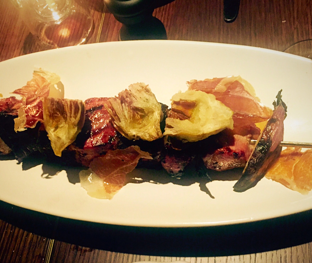 For mains, we had the Beef short rib Rossini, foie gras, autumn truffle & leeks (Just yes) which had a really soft/fall apart consistency similar to that of the short-rib that I have had in Perugia, the Hake with Lardo, Castelluccio lentils, tomato & rosemary and I shared the Veal Spiedino (for 2) with Jewish artichokes, pancetta & Marsala. Now. This is not just a skewer, this is something that some might consider a raft of food. The veal was cooked perfectly for my liking. Just as a note, this comes with two very large pieces of liver, which if you like liver, were delicious. That said, it will not be for everyone.