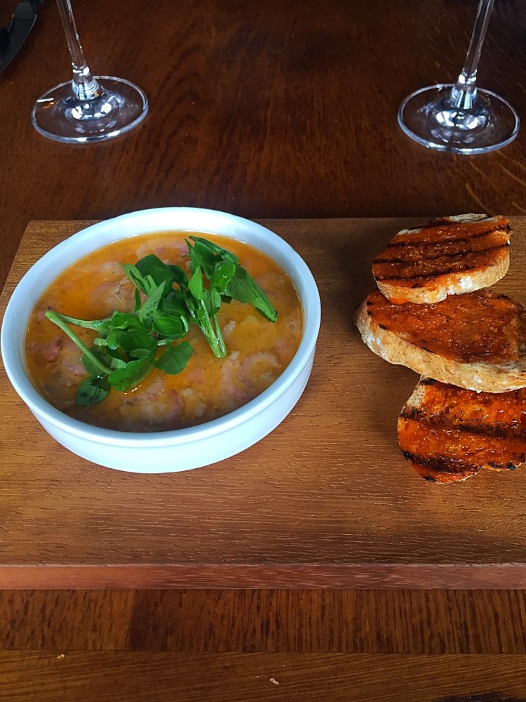 We opted for the starters of, the Pea and ham soup and the Potted prawns with crusty bread.